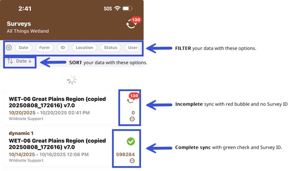 - Sync at the end of each day making sure that all data has a green checkmark and a Survey ID.