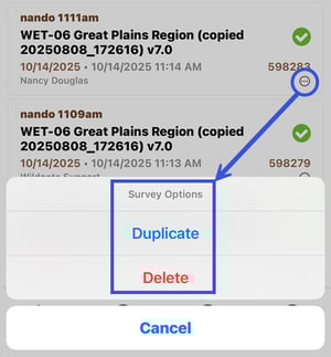 - You can touch the 3 dots on the bottom right of a survey name to perform two actions to the survey: Delete and Duplicate
